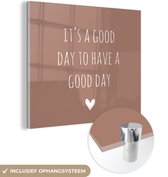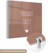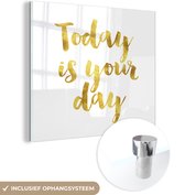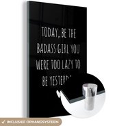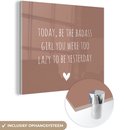 MuchoWow® Glasschilderij 90x90 cm - Schilderij acrylglas - Engelse quote "Today, be the badass you were to lazy to be yesterday" voor een bruine achtergrond - Foto op glas - Schilderijen