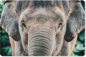 Een indrukwekkende close-up van een olifant met een vlekkerige huid. De olifant staat in de groene natuur en kijkt recht de camera in..