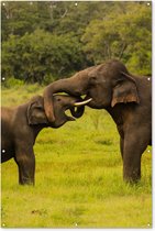 Tuinposter 120x180 cm - Tuindecoratie Circus" met olifant en aap op een groene achtergrond - Poster voor in de tuin - Buiten decoratie - Schutting tuinschilderij - Tuindoek muurdecoratie - Wanddecoratie balkondoek