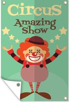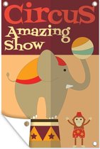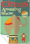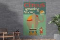 Een olifant staat op een verhoging en balanceert een bal op zijn slurf. Naast de olifant staat een schattige aap afgebeeld met zijn handen in de lucht. Deze afbeelding met de tekst "Circus, Amazing show" komt goed tot zijn recht in het interieur van een kinderkamer.