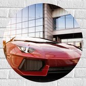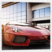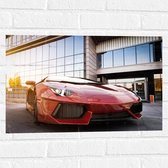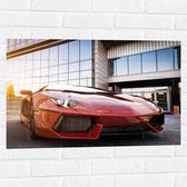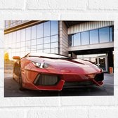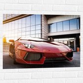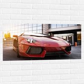 Muursticker - Rode Sportauto Geparkeerd voor Gebouw - 60x20 cm Foto op Muursticker
