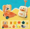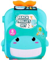Groene dinosaurus en gele eend zijn 2 schattige strandspeelsets die perfect zijn voor zomerse feestjes. 8-delige strandtrolleykoffer: 1 opbergdoos, 1 schep, 1 hark, 1 gieter, 4 scheepsmallen.
