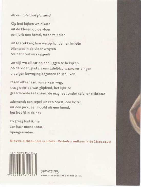 als een tafelblad glanzend Op bed kijken we elkaar uit de kleren op de vloer een jurk een hemd, meer valt er niet uit te trekken; hoe we op handen en knieën bijenwas in de vloer wrijven tot het hout was opgeeft terwijl we elkaar op bed liggen te bekijken op de vloer, glad als een tafelblad waarover dingen uit eigen beweging beginnen te schuiven tegen elkaar aan, van elkaar weg, traag over de was glijdend, het lijkt ze geen moeite te kosten, de magneet onder tafel onzichtbaar ademend; een tepel uit een borst, een borst uit een jurk, een hoofd uit een hemd, het hoofd in de nek zo graag had ik me aan haar mond totaal open gesneden.