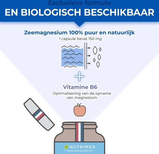 Zeemagnesium wordt op een natuurlijk manier verkregen door de verdamping van zeewater. Magnesiumzout is een complex van organische en anorganische zouten, daarom heeft het een magnesiumgehalte 5x hoger dan andere zouten zoals bisglycinaat. Zeemagnesium heeft bovendien zeer weinig contra-indicaties. Bijvoorbeeld : Zeemagnesium van Nutrimea levert 150mg magnesiumelementen. Eén capsule magnesium bisglycinaat levert enkel 50mg magnesiumelementen.