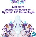 - De extra beschermingsvleugels ontplooien zich voorzichtig en vangen vocht op dat bij gewone tampons soms ontsnapt voor de ultieme bescherming tegen lekken (binnen het o.b.®- assortiment)