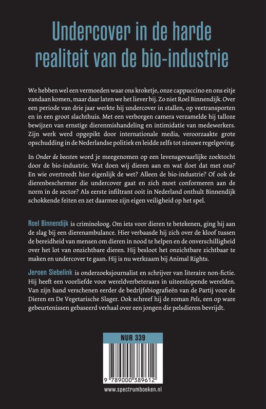 Je zult maar drie jaar lang onderduiken in de bio- industrie om met een verborgen camera om letterlijk te laten zien wat zich afspeelt in de stallen, vrachtwagens en slachthuis. Het is een zware klus die lijdt tot mentale problemen, een gebroken vinger, spanning in je relatie. Je ziet veel meer dan de verborgen camera, die vaak hapert en die camera-beelden zijn al verschrikkelijk. Als undercover activist ruik en voel je het ook, je jaagt met je eigen handen de dieren de dood in. Je doet mee aan het overtreden van de regels als de toezichthouder niet kijkt. Je doet mee aan wat voor de wet dierenmishandeling is. Je bent een schakel in dit moorddadige systeem. Dit boek laat je niet meer los omdat het een monster (dat we als samenleving hebben gecreëerd) in de bek kijkt. Kijk niet weg, lees dit boek, graag iedereen