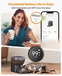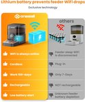 - Onze draadloze automatische feeders voor katten worden 100% aangedreven door de meegeleverde oplaadbare lithiumbatterij met een uithoudingsvermogen van 100 dagen. U hoeft er geen batterijen voor te kopen of u hoeft zich geen zorgen te maken dat het stopcontact wordt losgekoppeld, en u kunt de resterende batterijduur in dagen controleren, zowel in de app als op de feeder