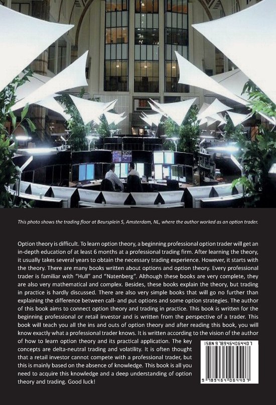 Option theory is difficult. To learn option theory, a beginning professional option trader will get an in- depth education of at least 6 months at a professional trading firm. After learning the theory, it usually takes several years to obtain the necessary trading experience. However, it starts with the theory. There are many books written about options and option theory. Every professional trader is familiar with “Hull” and “Natenberg”. Although these books are very complete, they are also very mathematical and complex. Besides, these books explain the theory, but trading in practice is hardly discussed. There are also very simple books that will go no further than explaining the difference between call- and put options and some option strategies. The author of this book aims to connect option theory and trading in practice. This book is written for the beginning professional or retail investor and is written from the perspective of a trader. This book will teach you all the ins and outs of option theory and after reading this book, you will know exactly what a professional trader knows. It is written according to the vision of the author of how to learn option theory and its practical application. The key concepts are delta-neutral trading and volatility. It is often thought that a retail investor cannot compete with a professional trader, but this is mainly based on the absence of knowledge. This book is all you need to acquire this knowledge and a deep understanding of option theory and trading. Good luck!