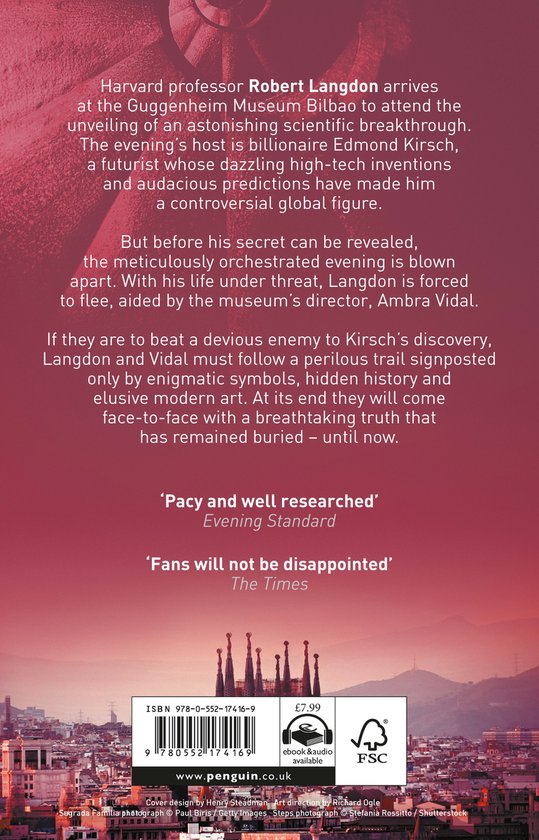But Langdon and several hundred guests are left reeling when the meticulously orchestrated evening is suddenly blown apart. There is a real danger that Kirsch’s precious discovery may be lost in the ensuing chaos. With his life under threat, Langdon is forced into a desperate bid to escape Bilbao, taking with him the museum’s director, Ambra Vidal. Together they flee to Barcelona on a perilous quest to locate a cryptic password that will unlock Kirsch’s secret.