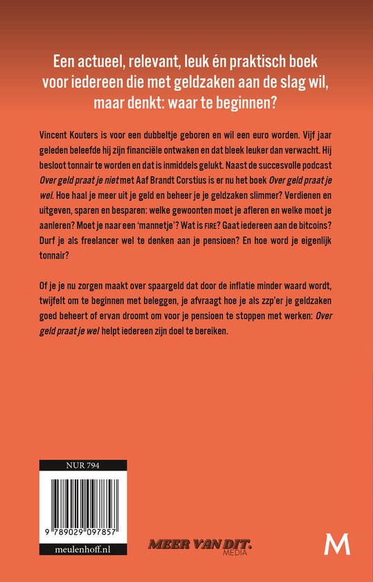 Vincent Kouters is voor een dubbeltje geboren en wil een euro worden. Vijf jaar geleden beleefde hij zijn financiële ontwaken en dat bleek leuker dan verwacht. Hij besloot tonnair te worden en dat is inmiddels gelukt. Naast de succesvolle podcast Over geld praat je niet met Aaf Brandt Corstius is er nu het boek Over geld praat je wel. Hoe haal je meer uit je geld en beheer je je geldzaken slimmer? Verdienen en uitgeven, sparen en besparen: welke gewoonten moet je afleren en welke moet je aanleren? Moet je naar een ‘mannetje’? Wat is fire? Gaat iedereen aan de bitcoins? Durf je als freelancer wel te denken aan je pensioen? En hoe word je eigenlijk tonnair?