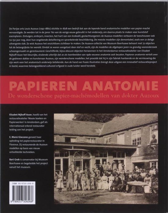 De Auzoux-collectie van Museum Boerhaave behoort met 72 objecten tot de belangrijkste ter wereld. Omdat ze waren aangetast door stof en vocht, zijn de modellen de afgelopen jaren na grondig vooronderzoek schoongemaakt en gerestaureerd. Geschilferde, bijna obscure objecten herwonnen in het Amsterdamse restauratieatelier van Elizabet Nijhoff-Asser het kleurrijke, stralende uiterlijk dat ze als toonbeelden van 19de-eeuwse anatomie ooit bezaten. Papieren anatomie vertelt over de gedreven dokter en kunstenaar Auzoux, zijn wonderschone modellen, het procédé dat hij in zijn fabriek hanteerde en de vernieuwing die zijn werk voor het anatomisch onderwijs betekende. Aan de hand van fraaie illustraties brengt deze uitgave een innovatief restauratieproject in beeld, waarmee belangwekkend cultureel erfgoed in oude luister werd hersteld.