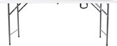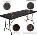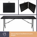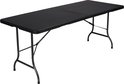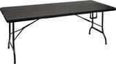 Product specificaties:, Basis productinformatie: - Primaire kleuren: Zwart - Extra kleuren: Zwart - Diepte van het product: 75 cm - Hoogte van het product: 72 cm - Breedte van het product: 180 cm - Gewicht Product: 12.2 kg - Materiaal: HDPE (hogedichtheidpolyethyleen) - Extra materiaal: PE (polyethyleen), Staal , Fysieke eigenschappen: - Gevouwen diepte: 90 cm - Opgevouwen hoogte: 8.6 cm - Gevouwen breedte: 75 cm - Aantal poten: 4 - Aantal personen: 6 , Technische gegevens: - Maximale belasting: 100 kg - Weerbestendig: Ja , Omgevingsgegevens: - Plaats van gebruik: Binnen en buiten - Opvouwbaar: Ja , Meegeleverd: - Handgreep: Ja