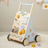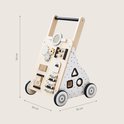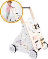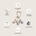 Je kleintje ontdekt de wereld met deze prachtige houten loopwagen in naturel hout, uitgevoerd in rustige zwart, grijs en witte tinten. Deze babywalker biedt niet alleen ondersteuning bij de eerste stapjes en stimuleert de motoriek, maar bevat ook diverse speelelementen. Zo is er een xylofoon om melodietjes mee te maken, een vormenstoof om vormen te leren herkennen, een rammelaar, een klein telraam om mee te oefenen met tellen, en een draai puzzel voor extra uitdaging. Bovenop vind je een klein spiegeltje, zodat je kindje zichzelf kan bewonderen tijdens het spelen.Met deze loopwagen is urenlang speelplezier verzekerd. Terwijl je kindje zich vermaakt met de verschillende spelletjes, wordt ook de motorische ontwikkeling gestimuleerd. Zodra het spelen klaar is, kan je kindje met de loopwagen zelf de omgeving gaan ontdekken en verkennen. Zo groeit je kleintje spelenderwijs in zelfstandigheid en beweging.
