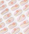 Breng de nagelsticker aan op je nagel en druk stevig aan. Strijk de randen glad met de platte kant van een woodstick en rol deze over de sticker. Laat 1 mm ruimte bij de nagelriem om loslaten te voorkomen. Knip de sticker op lengte, laat een klein randje over en hard 120 seconden uit onder de LED-lamp. - Stap 3: Afwerken