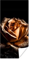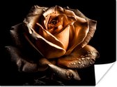 Portretfoto van gouden roos met waterdruppels tegen een zwarte achtergrond.