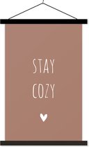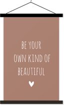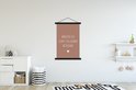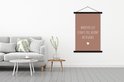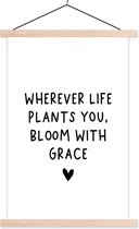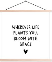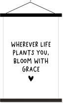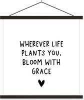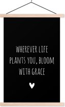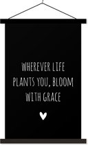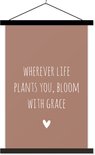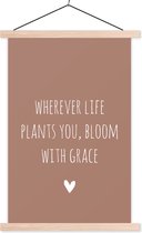 Posterhanger incl. Poster 120x180 cm - Schoolplaat - Engelse quote "Wherever life plants you, bloom with grace" met een hartje op een bruine achtergrond - Textielposter - Zwarte latten