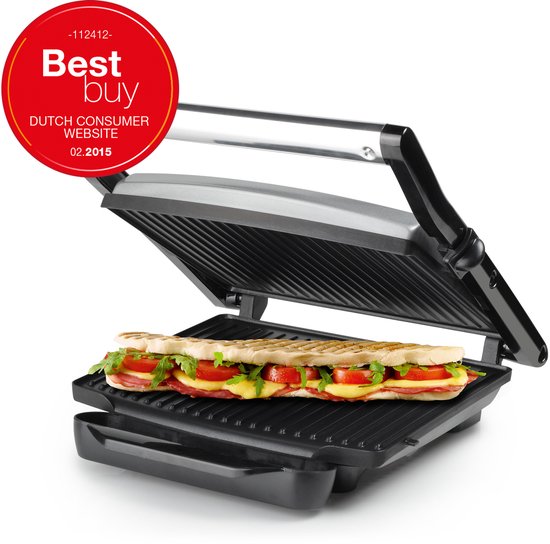 Onwijs blij met deze contact paniek grill. Wordt erg snel warm en is geschikt voor eigenlijk alles dat je maar wil grillen, van paninis tot groente en vlees Door de "zwevende" kap wordt hetgeen dat eronder ligt niet geplet. De aflopende platen en het lekbakje eronder zorgen er daarnaast voor dat overtollig vocht en vet wordt afgevoerd. Goede antiaanbaklaag waardoor je zelfs bij vlees of groente geen olie nodig hebt. Minpuntje is dat ie maar 1 stand heeft en de platen niet afneembaar zijn