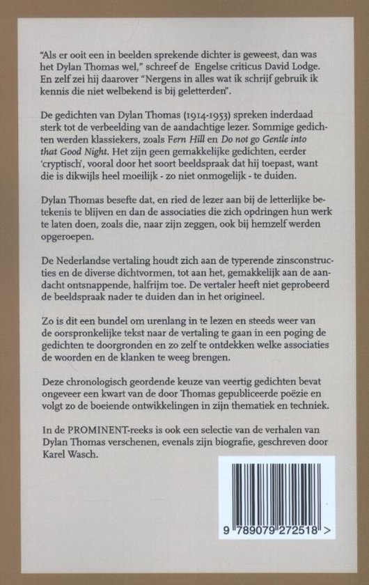 "Als er ooit een in beelden sprekende dichter is geweest, dan was het Dylan Thomas wel," schreef de Engelse criticus David Lodge. De gedichten van Dylan Thomas (1914-1953) spreken inderdaad sterk tot de verbeelding van de aandachtige lezer. Thomas schreef geen gemakkelijke gedichten, eerder 'cryptisch', vooral door het soort beeldspraak dat hij toepast. Dylan Thomas besefte dat, en ried de lezer aan bij de letterlijke betekenis te blijven en dan de associaties die zich opdringen hun werk te laten doen. De Nederlandse vertaling houdt zich aan de typerende zinsconstructies en de diverse dichtvormen, tot aan het, gemakkelijk aan de aandacht ontsnappende, halfrijm toe. De vertaler heeft niet geprobeerd de beeldspraak nader te duiden dan in het origineel. Zo is dit een bundel om urenlang in te lezen en steeds weer van de oorspronkelijke tekst naar de vertaling te gaan in een poging de gedichten te doorgronden en zo zelf te ontdekken welke associaties de woorden en de klanken te weeg brengen. Deze chronologisch geordende keuze van veertig gedichten bevat ongeveer een kwart van de door Thomas gepubliceerde poëzie en volgt zo de boeiende ontwikkelingen in zijn thematiek en techniek.