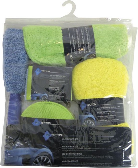 9-delige set. Bevat: 3x microfiber doek, 3x microfiber pad, microfiber wasspons, microfiber washandschoen, microfiber velgenborstel.