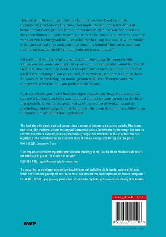 Hoe kan je luisteren en zien waar je cliënt precies voor komt bij jou als (beginnend) psycholoog? Hoe kan je het impliciete benoemen wat de cliënt bedoelt maar niet zegt? Hoe kan je contact met de cliënt maken, behouden en herstellen binnen het kader waarmee je werkt? Hoe kan je de cliënt serieus nemen wanneer zijn hechtingsstijl het je moeilijk maakt rustig in je stoel te zitten zonder in je eigen verhaal en je oude patronen terecht te komen? Hoe kan je jezelf dan resetten én je aandacht bij het therapeutische proces houden? Als antwoord op deze vragen reikt de auteur eenvoudige lichaamsgerichte technieken aan, onder meer gericht op over- en onderregulatie, vanuit het idee dat regulatie en zelfregulatie een van de sleutels is tot optimaal contact – met de ander én met jezelf. Deze oefeningen kan je eerst zelf, en vervolgens samen met cliënten doen. Zo wordt de behandeling een mooie, gezamenlijke reis. Therapie wordt zo samenwerken met behoud van professionele kaders. Dit boek is een uitnodiging om naar binnen te kijken. Naar binnen kijken is iets wat je kan leren. Het is een gewoonte die je kan toevoegen aan je levensstijl. Het effect van naar binnen kijken, is contact aangaan met jezelf. Dit verjongt, verzacht en vergroot het contact met anderen. Puck van Groningen (1967) heeft een eigen praktijk waarin zij multidisciplinair samenwerkt. Haar zoektocht naar optimaal contact en transparantie in de cliënt-therapeutrelatie heeft ertoe geleid dat ze evidenced based denken vanuit de psychologie, oplossingsgericht werken, de wijsheid van de school van Ridhwan en sensorimotor psychotherapie combineert.