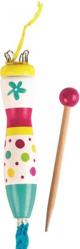 Punniken set. Deze set bevat een punnikklosje, houten naald en 4 kleuren wol. Het formaat van het punnikklosje is ongeveer 12,5 cm. Geschikt voor kinderen vanaf 4 jaar.