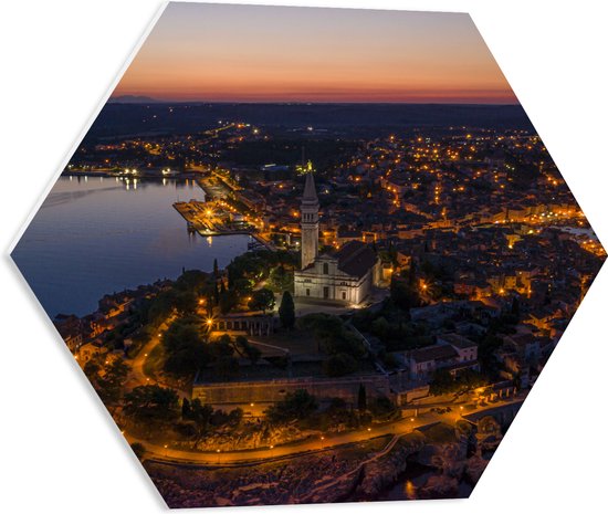 PVC Schuimplaat Hexagon - Kerkje in Midden van Verlicht Stadje - 50x43.5 cm Foto op Hexagon (Met Ophangsysteem)