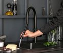 De Quooker Flex is de eerste heetwaterkraan voorzien van een flexibele uittrekslang! Het schoonspoelen van borden, een grote snijplank of de spoelbak zelf gaat hiermee vele malen makkelijker dan met een vaste kraan. De flexibele uittrekslang zorgt ervoor dat de kokend-water-toevoer direct gestaakt wordt: de kraan is hierdoor net zo veilig in gebruik als andere series en nog steeds voorzien van de kindveilige bedieningsknop.