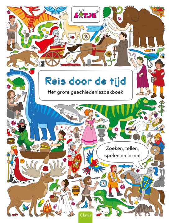 Reis door de tijd is een speels kijk- en zoekboek vol met opdrachten, spelletjes en weetjes over de geschiedenis van de wereld. Ontdek en kijk mee! In dit zoekboek ga je speuren bij de dino’s en op onderzoek bij de Romeinen en de ridders. Je leert de eerste mensen kennen en gaat op avontuur met de ontdekkingsreizigers! Het zoekboek heeft een groot formaat en is van karton en daardoor zeer stevig en geschikt voor jonge kinderen. Op elke twee bladzijden staat een grote kijkplaat met een nieuw thema. Zo start het boek met dino’s en de eerste mensen en vervolgens via de ridders en Romeinen naar de ontdekkingsreizigers. De illustraties zijn uitvoerig en op de tekeningen kun je eindeloos ontdekken. In een kader staan zoekopdrachten en op de plaat staan vragen die je kunt beantwoorden. Na de grote zoekplaten staan achter in het boek nog meer weetjes en spelletjes. Op deze manier kunnen kinderen spelenderwijs veel leren over geschiedenis. De illustraties zijn kleurrijk en getekend met een simpele lijnvoering. Deze stijl maakt het boek aantrekkelijk om te lezen en te bekijken met kinderen. Auteur Lizelot Versteeg heeft onder de naam Lotje meerdere van dit soort zoekboeken gemaakt met spelletjes, informatie en teluitdagingen. Jonge kinderen kunnen op deze manier spelenderwijs veel verschillende vaardigheden leren. De stijl van Lotje is in al deze boeken gelijk. Andere zoekboeken van Lotje zijn onder andere: Allemaal kleuren en Allemaal dieren. Kinderen kunnen in dit boek veel leren over de geschiedenis. Daarnaast leren ze dieren kennen en worden ze gestimuleerd met tellen. Zo heeft de auteur duizendpoten, botten en konijnen in de tekeningen verstopt, die je allemaal moet zoeken. Als grapje zijn er op de pagina’s nog extra figuren verstopt: een blauwe vlinder en een grijze spin. Kun jij ze vinden? Reis door de tijd is het grote geschiedenis-zoekboek van Lotje. In dit boek kun je zoeken, tellen, spelen en leren. Een interactief en aantrekkelijk boek voor kinderen vanaf ongeveer 4 jaar oud. Naast dit boek kun je op de website van de auteur nog meer spelletjes en mooie kleurplaten vinden: http://www.lotje.online. Dus als je kind na dit boek nog lang niet klaar is met tijdreizen, dan kan hij/zij hier verder genieten van de illustraties en creativiteit van auteur Lizelot Versteeg. Gelezen en gerecenseerd voor In de Boekenkast. Voor meer recensies: indeboekenkast.com.