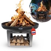Deze prachtige design RJRquality vuurschaal 80 cm XL voor buiten is multifunctioneel te gebruiken als terrashaard, BBQ, vuurkorf, tuinhaard, barbecue en zelfs als koeling voor uw drankjes in de zomer. ( Door de schaal te vullen met een stuk plastic). Helemaal compleet met vuurpook, afneembaar vonkenscherm, barbecue rooster en waterdichte hoes. Een must voor iedere tuin.