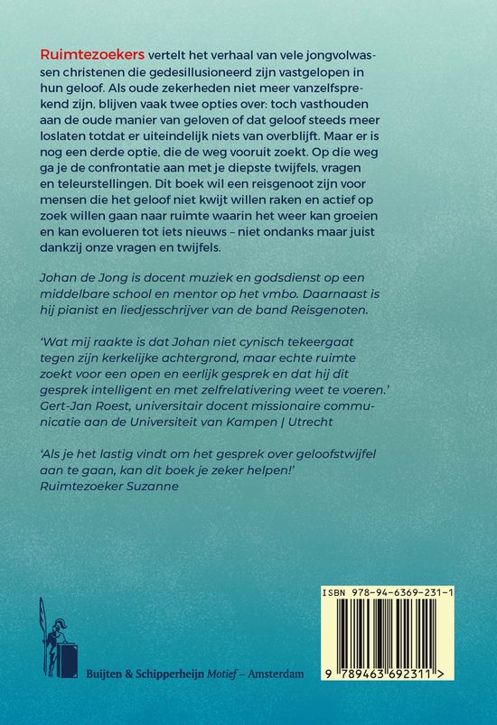 Ruimtezoekers vertelt het verhaal van vele jongvolwassen christenen die gedesillusioneerd zijn vastgelopen in hun geloof. Als oude zekerheden niet meer vanzelfsprekend zijn, blijven vaak twee opties over: toch vasthouden aan de oude manier van geloven of dat geloof steeds meer loslaten totdat er uiteindelijk niets van overblijft. Maar er is nog een derde optie, die de weg vooruit zoekt. Op die weg ga je de confrontatie aan met je diepste twijfels, vragen en teleurstellingen. Dit boek wil een reisgenoot zijn voor mensen die het geloof niet kwijt willen raken en actief op zoek willen gaan naar ruimte waarin het weer kan groeien en kan evolueren tot iets nieuws – niet ondanks maar juist dankzij onze vragen en twijfels. Johan de Jong is docent muziek en godsdienst op een middelbare school en mentor op het vmbo. Daarnaast is hij pianist en liedjesschrijver van de band Reisgenoten. ‘Wat mij raakte is dat Johan niet cynisch tekeergaat tegen zijn kerkelijke achtergrond, maar echte ruimte zoekt voor een open en eerlijk gesprek en dat hij dit gesprek intelligent en met zelfrelativering weet te voeren.’ Gert-Jan Roest, universitair docent missionaire communicatie aan de Universiteit van Kampen
