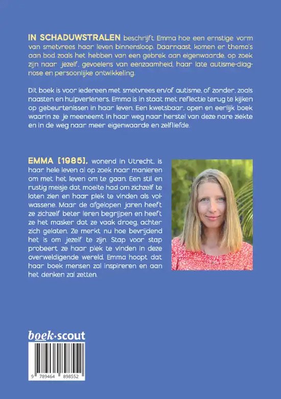 IN SCHADUWSTRALEN beschrijft Emma hoe een ernstige vorm van smetvrees haar leven binnensloop. Daarnaast komen er thema’s aan bod zoals het hebben van een gebrek aan eigenwaarde, op zoek zijn naar jezelf, gevoelens van eenzaamheid, haar late autisme-diagnose en persoonlijke ontwikkeling. Dit boek is voor iedereen met smetvrees en/of autisme, of zonder, zoals naasten en hulpverleners. Emma is in staat met reflectie terug te kijken op gebeurtenissen in haar leven. Een kwetsbaar, open en eerlijk boek waarin ze je meeneemt in haar weg naar herstel van deze nare ziekte en in de weg naar meer eigenwaarde en zelfliefde.