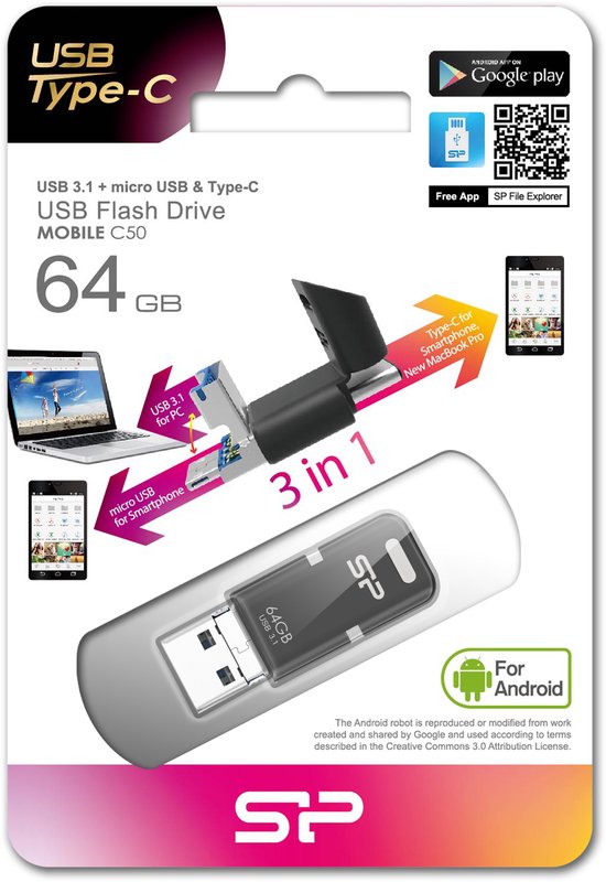Wat de Mobile C50 zo bijzonder maakt is dat het USB, micro USB en USB-C in één is. Nooit meer een gebrek aan de juiste verbinding dus. Maak gemakkelijk ruimte vrij op uw smartphone of zet, bijvoorbeeld, uw foto’s over van tablet naar PC. Meer flexibiliteit en vrijheid, zonder kabels of netwerkbeperkingen en dat in één kleine, compacte pendrive. Hij heeft een fraaie uitsparing zodat hij aan een sleutelhanger kan. De C50 heeft een goede en ergonomische grip en is makkelijk in te pluggen en te verwijderen.