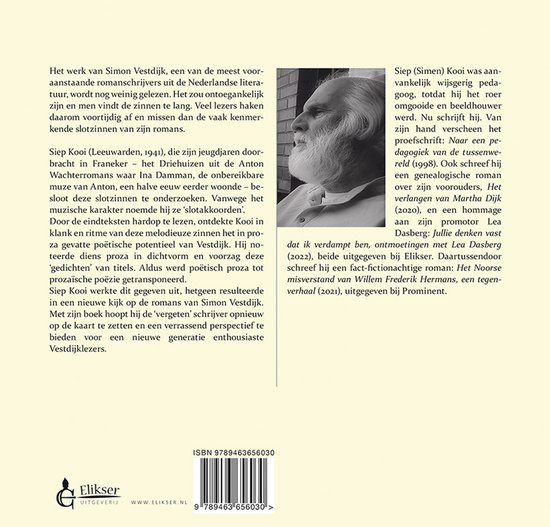 Het werk van Simon Vestdijk, een van de meest vooraanstaande romanschrijvers uit de Nederlandse literatuur, wordt nog weinig gelezen. Het zou ontoegankelijk zijn en men vindt de zinnen te lang. Veel lezers haken daarom voortijdig af en missen dan de vaak kenmerkende slotzinnen van zijn romans. Siep Kooi (Leeuwarden, 1941), die zijn jeugdjaren doorbracht in Franeker – het Driehuizen uit de Anton Wachterromans waar Ina Damman, de onbereikbare muze van Anton, een halve eeuw eerder woonde – besloot deze slotzinnen te onderzoeken. Vanwege het muzische karakter noemde hij ze ‘slotakkoorden’. Door de eindteksten hardop te lezen, ontdekte Kooi in klank en ritme van deze melodieuze zinnen het in proza gevatte poëtische potentieel van Vestdijk. Hij noteerde diens proza in dichtvorm en voorzag deze ‘gedichten’ van titels. Aldus werd poëtisch proza tot prozaïsche poëzie getransponeerd. Siep Kooi werkte dit gegeven uit, hetgeen resulteerde in een nieuwe kijk op de romans van Simon Vestdijk. Met zijn boek hoopt hij de ‘vergeten’ schrijver opnieuw op de kaart te zetten en een verrassend perspectief te bieden voor een nieuwe generatie enthousiaste Vestdijklezers. Siep (Simen) Kooi was aanvankelijk wijsgerig pedagoog, totdat hij het roer omgooide en beeldhouwer werd. Nu schrijft hij. Van zijn hand verscheen het proefschrift: Naar een pedagogiek van de tussenwereld (1998). Ook schreef hij een genealogische roman over zijn voorouders, Het verlangen van Martha Dijk (2020), en een hommage aan zijn promotor Lea Dasberg: Jullie denken vast dat ik verdampt ben, ontmoetingen met Lea Dasberg (2022), beide uitgegeven bij Elikser. Daartussendoor schreef hij een fact-fictionachtige roman: Het Noorse misverstand van Willem Frederik Hermans, een tegenverhaal (2021), uitgegeven bij Prominent.