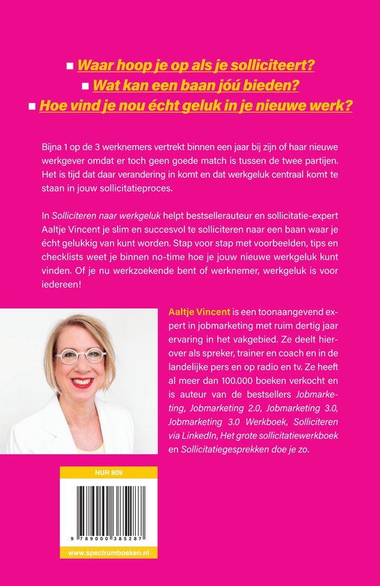 In haar nieuwe boek richt Aaltje Vincent, een van de grootste specialisten op het gebied van solliciteren, zich op het vinden van werkgeluk. Uit onderzoek blijkt dat bijna een derde van alle werkenden al na een jaar vertrekt bij een organisatie omdat er toch geen goede match is tussen de werknemer en de werkgever. Het is tijd dat daar verandering in komt en dat geluk centraal komt te staan in het sollicitatieproces.