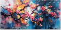 Roze bloemen bloeien aan donkere takken, omlijst door een expressieve achtergrond met blauw, oranje en geel, wat een levendige en artistieke sfeer creëert..