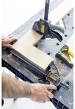 Om een werkstuk vast te zetten heb je nog klemmen nodig, deze zijn niet inbegrepen. De werkbank is compatibel met verschillende afmetingen en merken van klemmen zoals bv. STANLEY of Irwin.