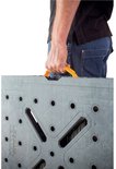 Deze werktafel heeft inklapbare poten die je door een simpele druk op de knop in 3 seconden kan in- en uitklappen. De metalen poten hebben een draagkracht tot 450 kg. Dankzij het grote werkvlak van 85 bij 60 centimeter en de 80 cm werkhoogte is deze werktafel ideaal voor de meeste klussen. Het X-profiel en de verschillende uitsparingen in het werkblad laten toe om op verschillende manieren werkstukken te klemmen, zowel horizontaal als verticaal. De handgreep zorgt voor makkelijk en ergonomisch transport. De ingeklapte werktafel heeft een dun profiel van 11 cm waardoor deze heel handig op te bergen is onder kasten of makkelijk op te hangen aan de muur.