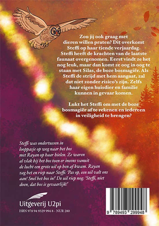 Zou jij ook graag met dieren willen praten? Dit overkomt Steffi op haar tiende verjaardag. Steffi heeft de krachten van de laatste faunaat overgenomen. Eerst vindt ze het nog leuk, maar dan komt ze oog in oog te staan met Silas, de boze bosmagiër. Als Steffi de strijd met hem aangaat, zal dat niet zonder risico's zijn. Zelfs haar eigen huisdier en familie kunnen in gevaar komen. Lukt het Steffi om met de boze bosmagiër af te rekenen en iedereen in veiligheid te brengen?