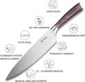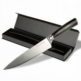 Een goed koksmes is het beste ingrediënt voor uw keuken. Een koksmes is geschikt voor het snijden van groente, kruiden, vlees en vis. Peperkorrels kneuzen, een avocado in fijne plakjes snijden of uw rauwe vis voorbereiden voor sashimi, het kan allemaal met deze all-rounder. Het lemmet is gemaakt van Duits staal en heeft een hardheid van 58-60 HR. Het handvat is gemaakt van Pakkahout en heeft een goede, ergonomische grip. Deze handige set bevat ook een mesbeschermer, een messenslijper en en vingerbeschermer.