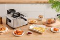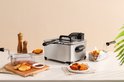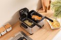 - Je kunt gemakkelijk verschillende producten tegelijk frituren dankzij de 2 kleine mandjes of een grote portie in één keer frituren
