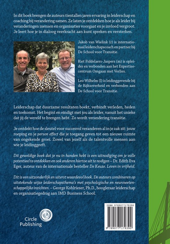 In dit boek brengen de auteurs tientallen jaren ervaring in leiderschap en coaching bij verandering samen. Ze laten je ontdekken hoe je als leider bij veranderingen mensen en organisaties voorgaat en je invloed vergroot. Je leert hoe je in dialoog veerkracht aan kunt spreken en versterken. Jakob van Wielink is internationaal leiderschapscoach en partner bij De School voor Transitie. Riet Fiddelaers-Jaspers is opleider en verbonden aan het Expertisecentrum Omgaan met Verlies. Leo Wilhelm is leidinggevende bij de Rijksoverheid en verbonden aan De School voor Transitie. Leiderschap dat duurzame resultaten boekt, verbindt verleden, heden en toekomst. Het begint en eindigt met jou als leider, vanuit het unieke dat jij de wereld te brengen hebt. Zo wordt verandering transitie. Je ontdekt hoe de sleutel voor succesvol veranderen al in je zak zit: jouw roeping en je person effect die je toegang geven tot een nieuwe ruimte van ongekende groei. Zowel van jezelf als de talentvolle mensen aan wie je leidinggeeft. Dit geweldige boek dat je nu in handen hebt is een uitnodiging om je volle potentieel te ontdekken en ook anderen hiertoe uit te nodigen – Dr. Edith Eva Eger, auteur van de internationale bestseller De Keuze. Leven in vrijheid. Dit is een uitzonderlijk en uiterst waardevol boek. De auteurs combineren op uitstekende wijze leiderschapsthema’s met psychologische en neurowetenschappelijke inzichten. – George Kohlrieser, Ph.D., hoogleraar leiderschap en organisatiegedrag aan IMD Business School.