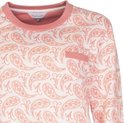 De top heeft een elegant all-over paisley dessin in een zachte roze tint op een gebroken witte achtergrond. Lange mouwen met unie roze boorden en een unie boord aan de zoom zorgen voor een stijlvolle afwerking. De ronde hals met subtiele bies voegt een verfijnde touch toe, terwijl het opgestikte zakje een praktisch en decoratief detail biedt.
