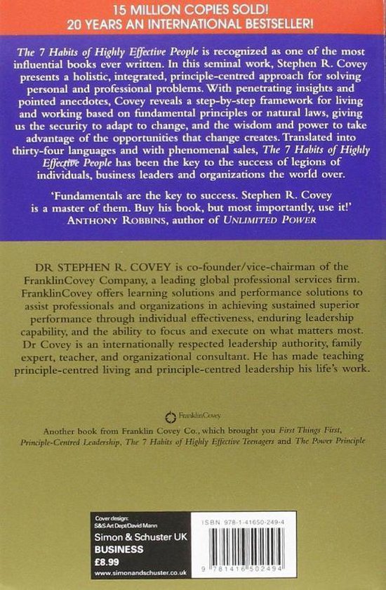 In THE 7 HABITS OF HIGHLY EFFECTIVE PEOPLE Stephen R. Covey presents a holistic, integrated, principle-centred approach for solving personal and professional problems. With penetrating insights and pointed anecdotes, Covey reveals a step-by-step pathway for living with fairness, integrity, honesty and human dignity - principles that give us the security to adapt to change, and the wisdom and power to take advantage of the opportunities that change creates. 'Fundamentals are the key to success. Stephen Covey is the master of them. Buy his book, but most importantly, use it!' - Anthony Robbins, author of UNLIMITED POWER.