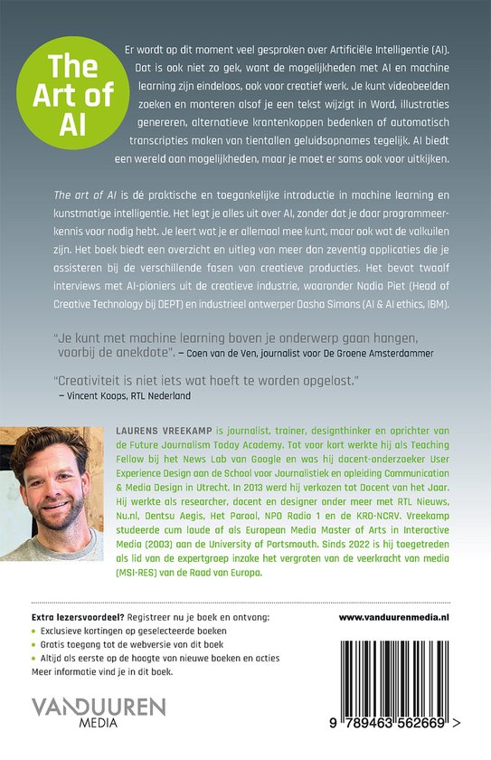 The Art of AI is dé praktische en toegankelijke introductie in machine learning en kunstmatige intelligentie. Het legt je alles uit over AI, zonder dat je daar programmeerkennis voor nodig hebt. Je leert wat je er allemaal mee kunt, maar ook wat de valkuilen zijn. Het boek biedt een overzicht en uitleg van meer dan zeventig applicaties die je assisteren bij de verschillende fasen van creatieve producties. Het bevat twaalf interviews met AI-pioniers uit de creatieve industrie, waaronder Nadia Piet (Head of Creative Technology bij DEPT) en industrieel ontwerper Dasha Simons (AI & AI ethics, IBM).