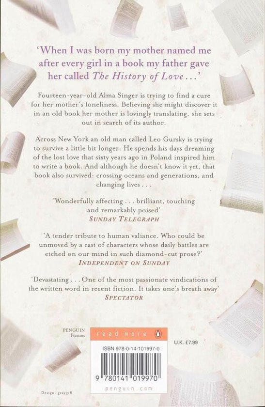 Across New York an old man called Leo Gursky is trying to survive a little bit longer. He spends his days dreaming of the love lost that sixty years ago in Poland inspired him to write a book. And although he doesn't know it yet, that book also survived: crossing oceans and generations, and changing lives. . .