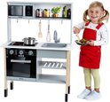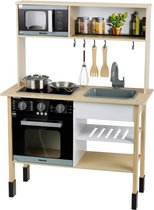 - De speelkeuken is voorzien van een fornuis, magnetron, een uitneembare spoelbak en elegant kookgerei van metaal en hout.
