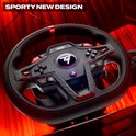 - Het veelzijdige, ergonomische stuur (diameter van 28 cm) heeft 25 actieknoppen, waaronder 2 draaiknoppen met dubbele activering, en een sportief nieuw ontwerp met geperforeerd leer en imitatie carbonafwerking.