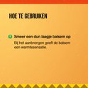 Voor de unieke warmtesensatie smeert u een dun laagje balsem op. Het aan te raden om de huid af te dekken zodat de warmte blijft hangen en er geen vlekken op kleding ontstaan.