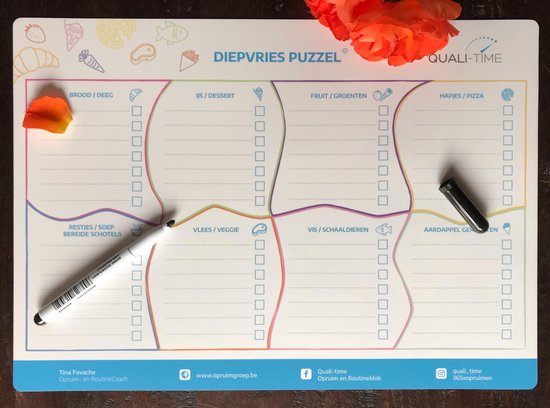 Ik kocht deze diepvriespuzzel en ondervond direct het gemak van dit handige overzicht! Dus bestelde ik meteen een 2e exemplaar zodat ik ook zo’n overzicht heb voor de kleine diepvries aan de koelkast. Super handig, overzicht per soort (vlees, vis, hapjes, desserts,...) , gemakkelijk aan te vullen met de uitveegbare stift (ook gemakkelijk uit te ‘gommen’ dus) , diepvriesmanagement is zoveel eenvoudiger nu, niet in schuiven beginnen rommelen om te zien wat er nog in zit, gewoon kijken en beslissen, we kunnen vandaag dat vlees eten, met die groenten en oja er zijn ook nog kroketjes voor daarbij... Aanrader!