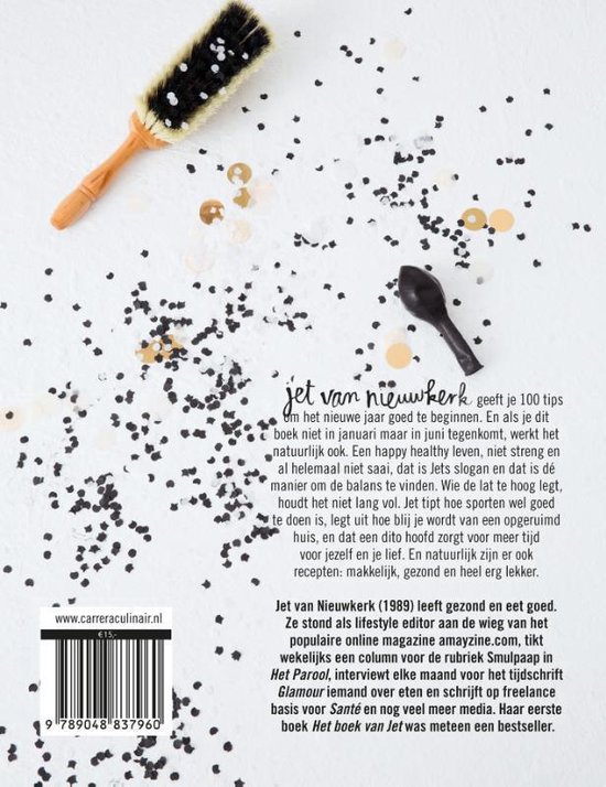 Jet van Nieuwkerk geeft je 100 tips om het nieuwe jaar goed te beginnen. En als je dit boek niet in januari maar in juni tegenkomt, werkt het natuurlijk ook. Een happy healthy leven, niet streng en al helemaal niet saai, dat is Jets slogan en dat is dé manier om de balans te vinden. Wie de lat te hoog legt, houdt het niet lang vol. Jet tipt hoe sporten wel goed te doen is, legt uit hoe blij je wordt van een opgeruimd huis, en dat een dito hoofd zorgt voor meer tijd voor jezelf en je lief. En natuurlijk zijn er ook recepten: makkelijk, gezond en heel erg lekker.